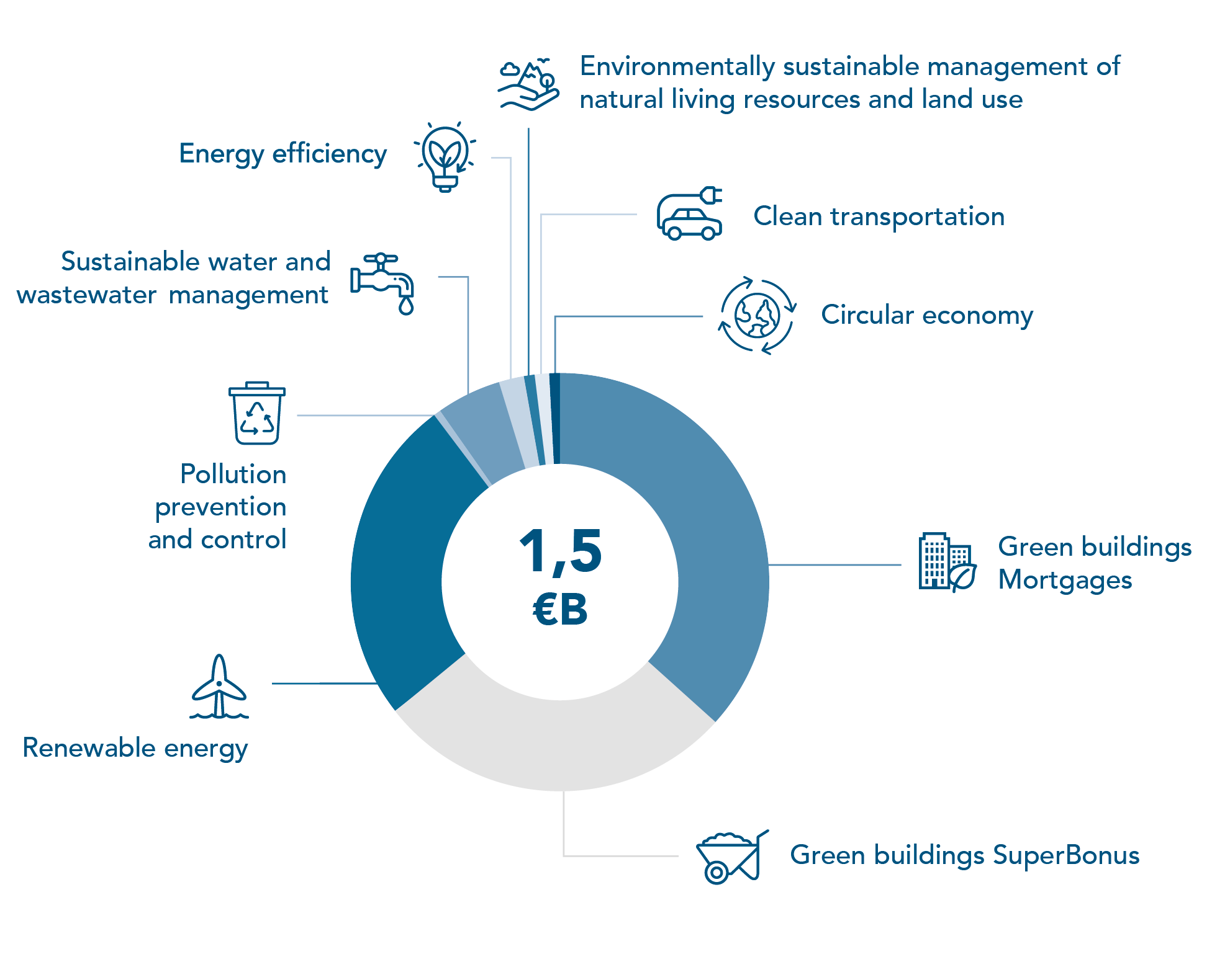 Donut chart showing: green building mortgages, sustainable water and wastewater management, clean trasnportation, energy efficiency, environmentally sustainable management of living natural resources and land use, pollution prevention and control, renewable energies and green building superbonus 110%
